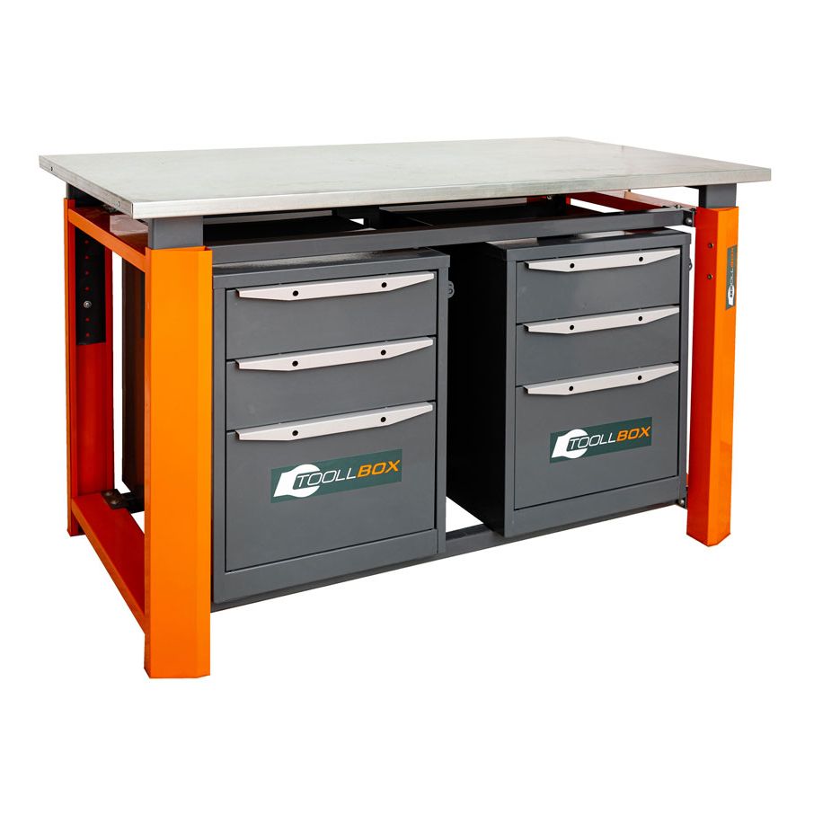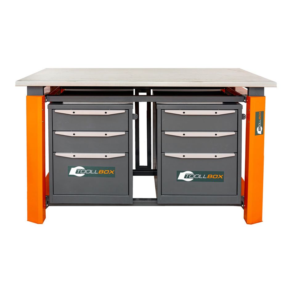 Хранение организовано по классической и удобной схеме: две тумбы, и в каждой — по три выдвижных ящика. Получается шесть ящиков под разный «калибр» — от измерительного инструмента до оснастки и крепежа, чтобы рабочая поверхность оставалась рабочей, а не превращалась в склад.