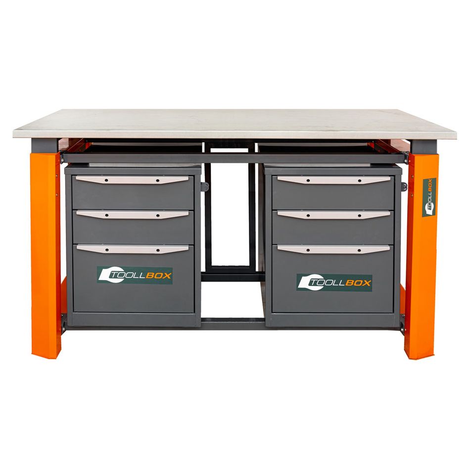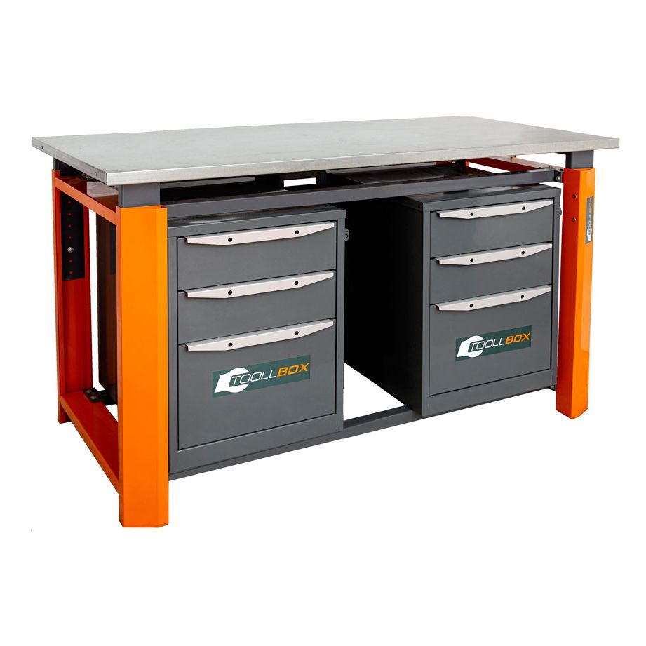 Верстак ТВР1800 (ТВ3-ТВ3) — это вместительное и продуманное рабочее место для мастерской, гаража, сервисной зоны или производственного участка, где важны не только прочность, но и удобная организация инструмента. Модель выполнена в двухтумбовой компоновке: по обеим сторонам расположены тумбы с тремя выдвижными ящиками, поэтому все необходимое можно держать под рукой, не загромождая столешницу.